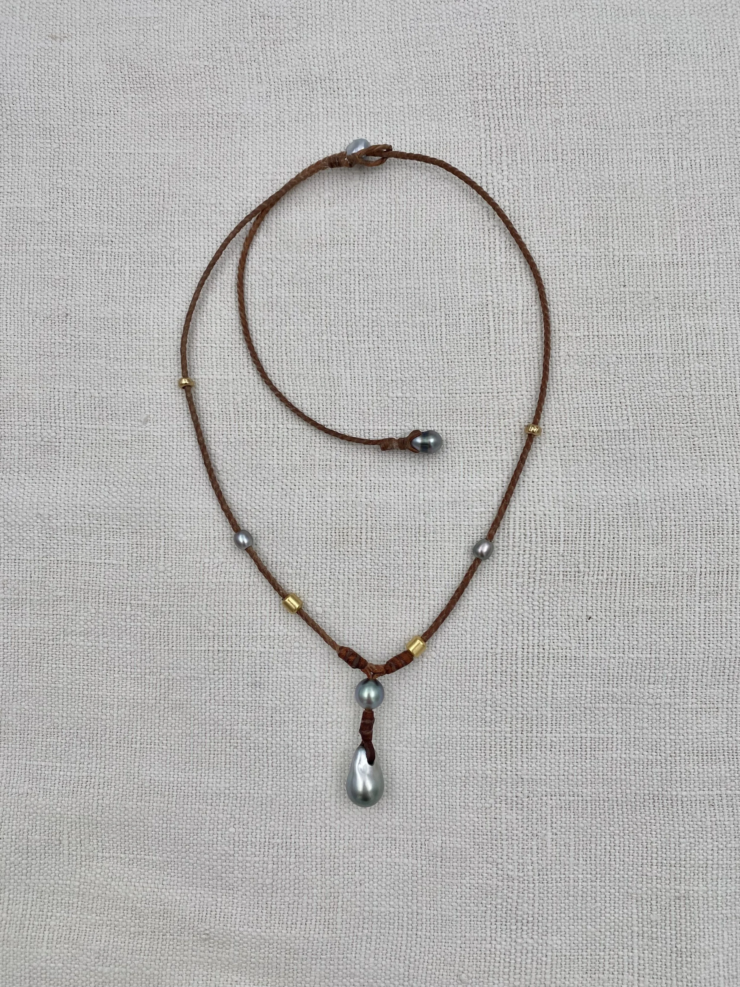 A slightly new take on our simple Coco style, includes a knotted drop charm and sliding gold beads.