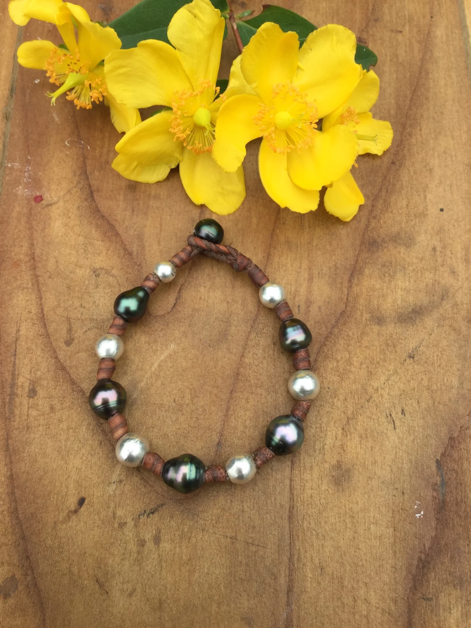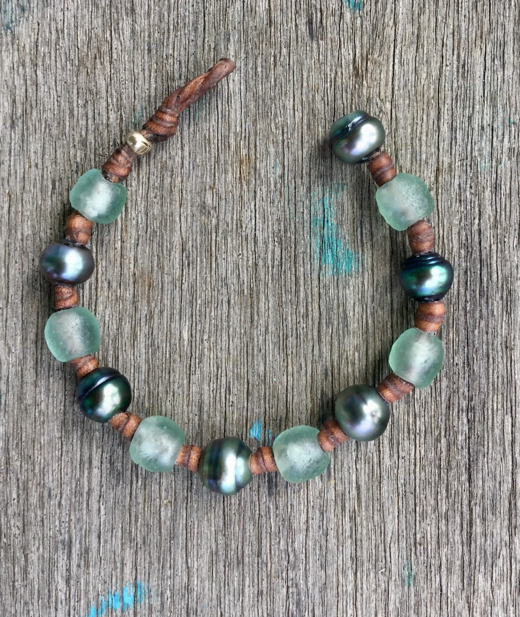 TAHITIAN PEARLS - AFRICAN RECYCLED GLASS BEADS - GOLD DETAIL